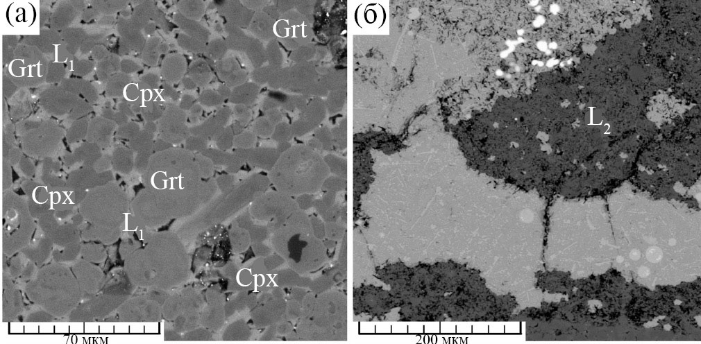 Рис. 1. Микрофотографии в отраженных электронах силикатной части экспериментального образца: (а) Grt–Cpx-матрица с межзерновым стеклом (L1); (б) массивные выделения стекла инъекционного расплава (L2) в рудной части.