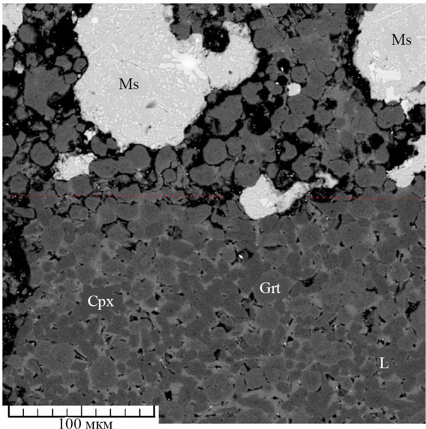 Силикатная фракция представлена ассоциацией Grt + Cpx и силикатным стеклом – закаленным силикатным расплавом в виде межзерновых и сплошных (инъекционных) выделений (рис. 1, табл. 1). Межзерновой расплав (L1) встречается в виде пленок между Grt и Cpx в силикатной части образца. Большая часть силикатного расплава (L2) отделялась от Grt–Cpx-рестита, образуя скопления в рудной части образца. При миграции и внедрении силикатный расплав захватывал отдельные порции сульфидов. Концентрации сидерофильных элементов в силикатной компоненте закалённых образцов ниже предела обнаружения (0.1 мас. %) на микрозонде.
