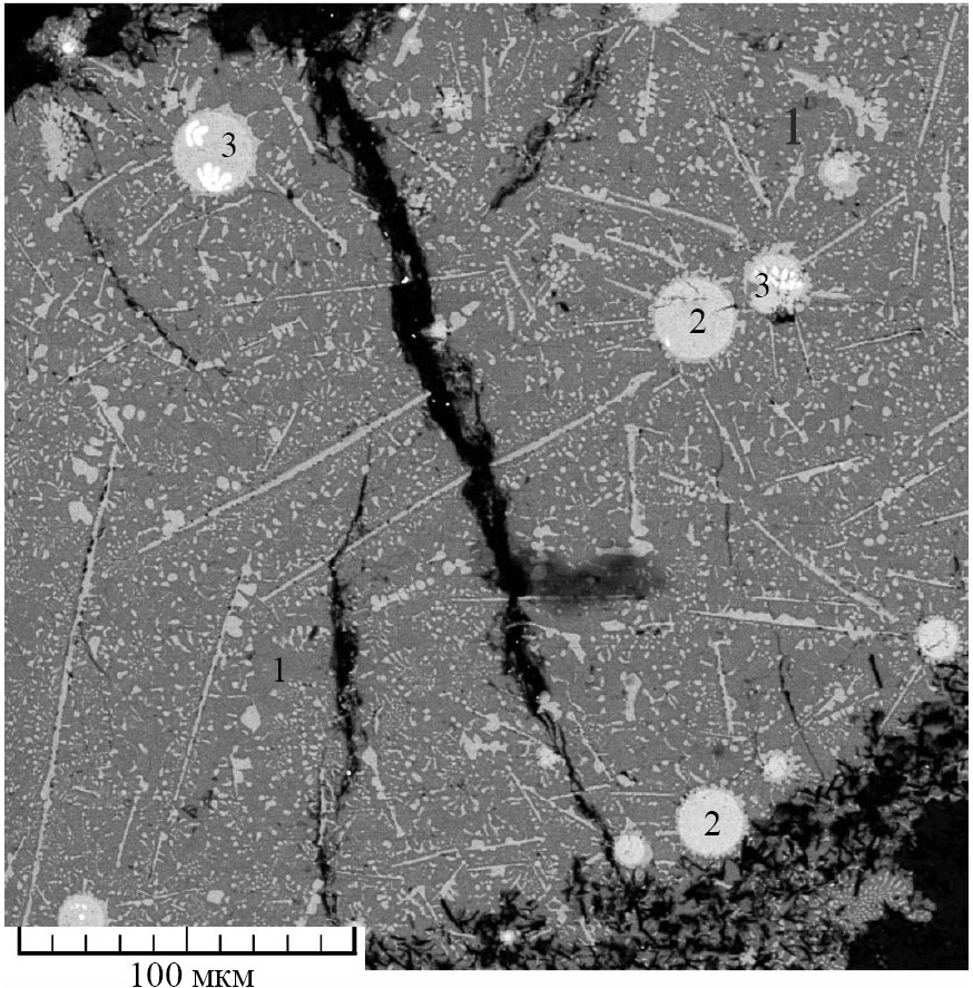 Рис. 3. Микрофотография в отраженных электронах массивных сульфидов с включениями однофазных и полифазных Fe-металлических глобулей: 1 – закалочная сульфидная матрица, 2 – однофазные Fe-металлические глобули, 3 – полифазные Fe-металлические глобули.