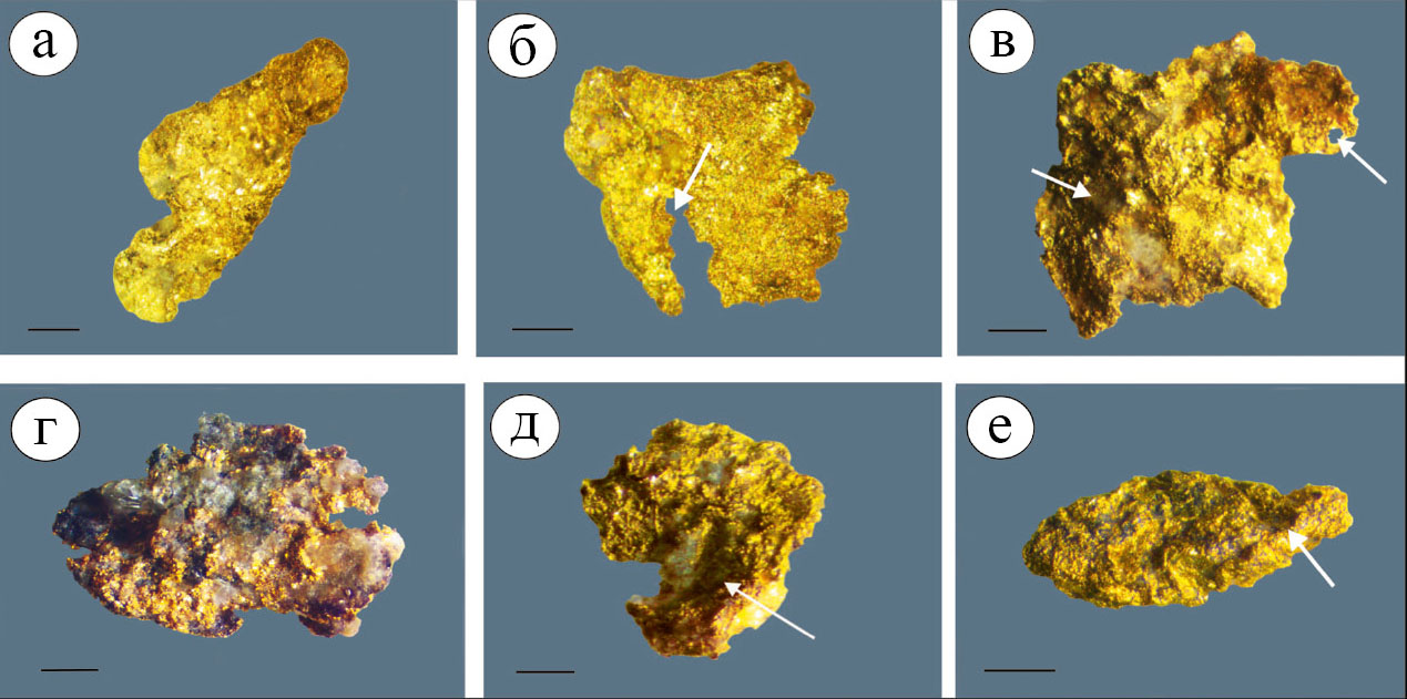 Преобладающая часть изученных частиц имеет хорошую и среднюю окатанность. Золото характеризуется сглаженными ребрами и округлыми контурами, иногда грубоямчатой поверхностью с отпечатками вдавливания минералов вмещающих отложений (рис. 3 а–в). По данным микрозондового анализа пробность изученного золота варьирует в диапазоне от 720 до 1000‰ и в среднем составляет 903‰. Содержание элементов примесей не превышает предел обнаружения микрозондового анализатора.