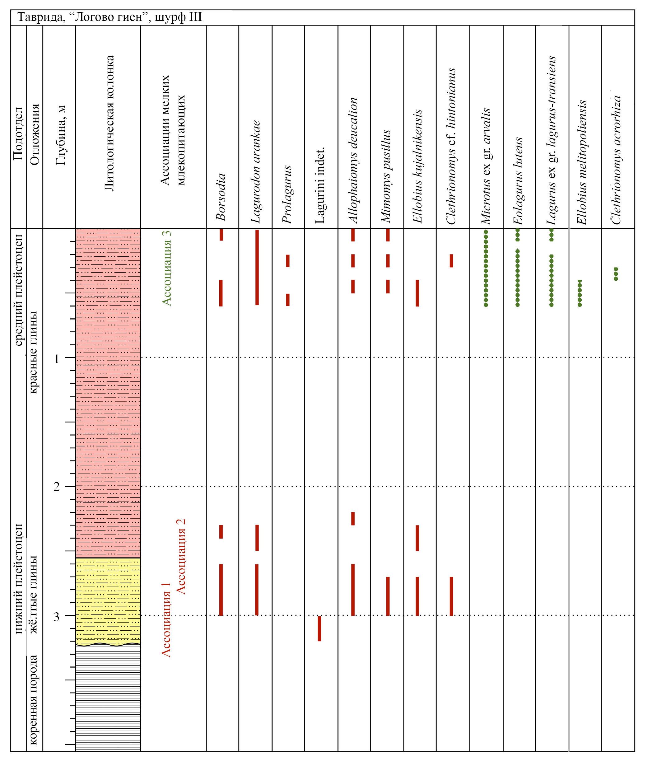 Рис. 1. Пещера Таврида, точка “Логово гиен”, шурф III: схематический разрез и распределение таксонов полевок в разрезе. Красными (сплошными) линиями показаны находки таксонов фаунистических ассоциаций 1 и 2 (нижний плейстоцен), зелеными (пунктирными) линиями показаны таксоны ассоциации 3 (средний плейстоцен). Ассоциации 1 и 2 встречены в нижней части разреза и в переотложенном виде в верхней части; ассоциация 3 встречена только в верхней части разреза. Средняя часть разреза лишена ископаемых остатков мелких млекопитающих. Линии усредняют находки ископаемых остатков в условных горизонтах, глубина которых кратна 10 см.