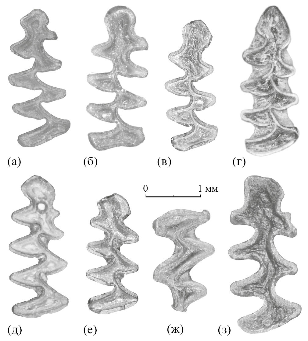 Рис. 2. Главные виды-индексы Arvicolinae из нижнего плейстоцена пещеры Таврида: а – Borsodia ex gr. newtoni-arankoides, экз. ПИН, № 5644/2001, правый M1; б – Lagurodon arankae (Kretzoi, 1954), экз. ПИН, № 5644/2051, правый M1; в – Prolagurus ternopolitanus Topachevsky, 1973, экз. ПИН, № 5644/2101, правый M1; г – Allophaiomys deucalion Kretzoi, 1969, экз. ПИН, № 5644/2151, правый M1; д – Mimomys ex gr. reidi-pusillus, экз. ПИН, № 5644/2201, правый M1; е – Clethrionomys cf. hintonianus Kormos, 1934, экз. ПИН, № 5644/2251, правый M1; ж – Pitymimomys pitymyoides (Jánossy et van der Meulen, 1975), экз. ПИН, № 5644/2301, левый M2; з – Ellobius kujalnikensis Topachevsky, 1965, экз. ПИН, № 5644/2351, правый M1.