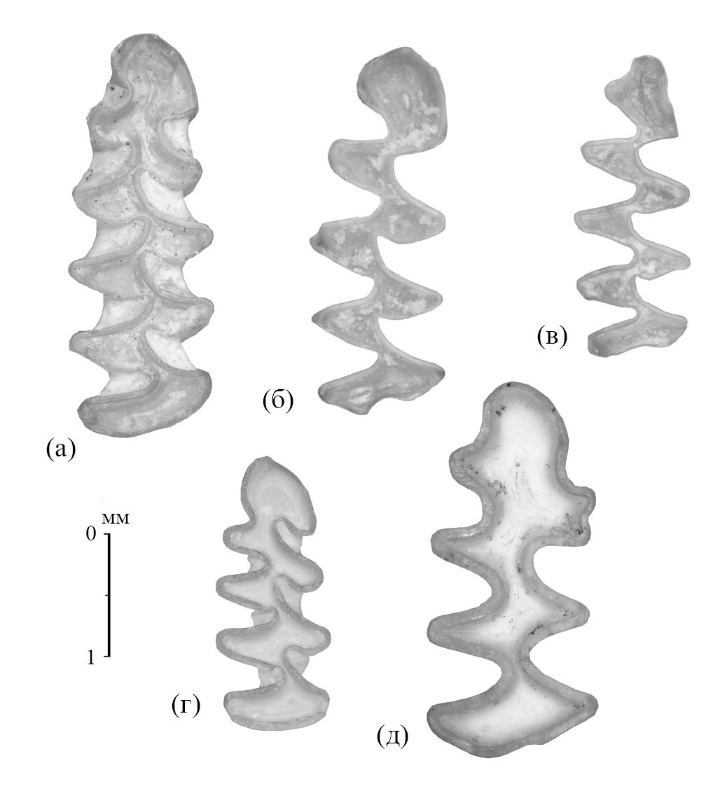 Рис. 3. Главные виды-индексы Arvicolinae из среднего плейстоцена пещеры Таврида: а – Microtus ex gr. arvalis (Pallas, 1779), экз. ПИН, № 5644/2401, правый M1; б – Eolagurus luteus (Eversmann, 1840), экз. ПИН, № 5644/2451, правый M1; в – Lagurus ex gr. transiens-lagurus, экз. ПИН, № 5644/2501, левый M1, отражённый; г – Clethrionomys acrorhiza Kormos, 1933, экз. ПИН, № 5644/2551, левый M1, отраженный; д – Ellobius melitopoliensis Topachevsky, 1973, экз. ПИН, № 5644/2601, левый M1, отражённый.