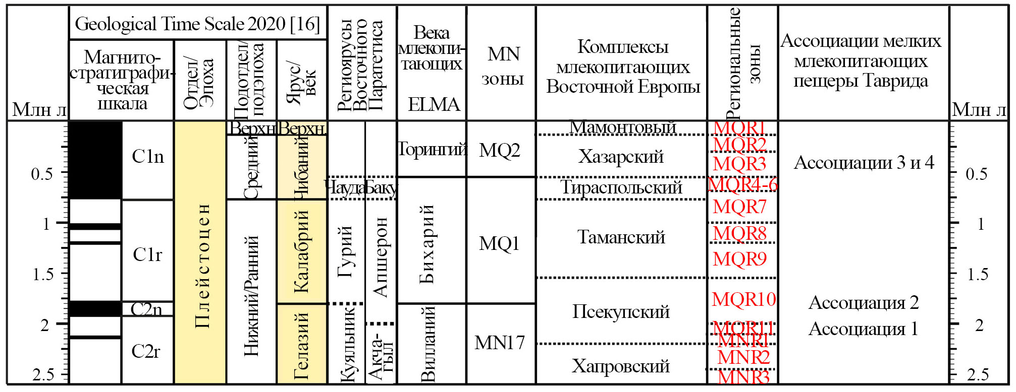 Рис. 4. Положение плейстоценовых ассоциаций мелких млекопитающих пещеры Таврида в стратиграфических и биохронологических схемах.