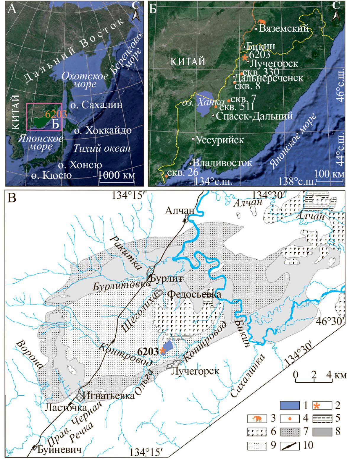 Рис. 1. Расположение обнажения 6203, вскрывшего фрагмент бивня Mammuthus trogonterii (а), скважин, вскрывающих отложения среднего плейстоцена на юге Дальнего Востока (б), и геологическая карта Нижнебикинской впадины (в) [16]. 1 – Лучегорский буроугольный разрез, 2 – обнажение 6203, 3 – первое местонахождение костных останков Mammuthus trogonterii; 4 – скважины вскрывающие отложения среднего плейстоцена, 5 – плиоценовые галечники, 6 – плиоцен-четвертичные плато-базальты. Свиты эоцен-нижнеолигоценовых континентальных отложений: 7 – контроводская, 8 – лучегорская, 9 – бикинская; 10 – железная дорога.