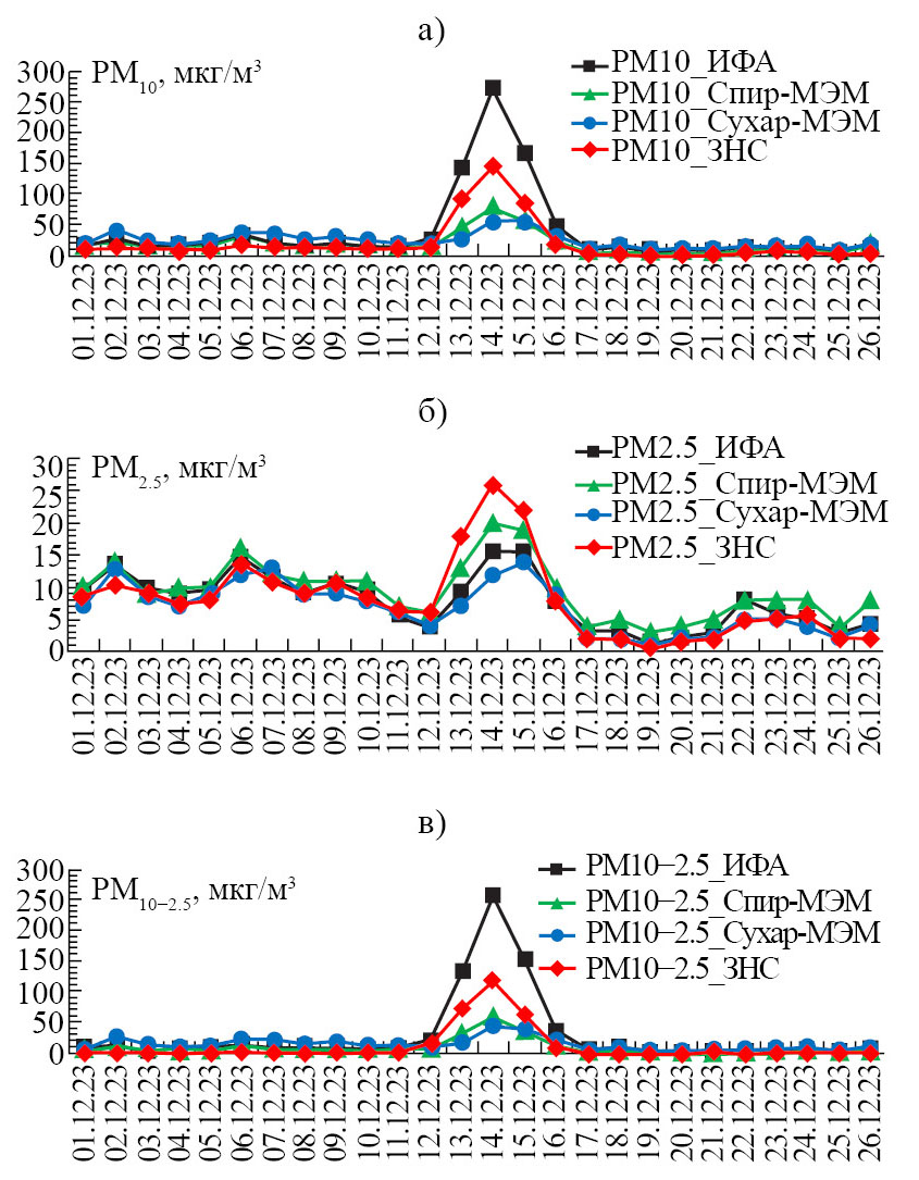 Непрерывные наблюдения за микрофизическими характеристиками и массовой концентрацией аэрозолей в приземном слое атмосферы московского мегаполиса и загородной зоны способствуют выявлению нетипичных случаев аномального изменения аэрозольных параметров [14]. 13–16 декабря 2023 года в пунктах наблюдений ИФА РАН в Москве (далее ИФА) и пригороде, примерно в 50 км к западу от города, на Звенигородской научной станции ИФА РАН (далее – ЗНС), а также на московской городской сети автоматических станций контроля загрязнения атмосферы (АСКЗА) ГПБУ “Мосэкомониторинг” (МЭМ) [http://mosecom.mos.ru/] наблюдался рост концентрации аэрозольных частиц различных размерных фракций, нехарактерный для этого региона в зимний сезон (рис. 1). В этот период величина массовой концентрации частиц РМ10 в некоторые сутки превышала среднесуточную предельно-допустимую концентрацию (ПДК = 60 мкг/м3) как в городе, так и в пригороде. Рост массовой концентрации более мелкой фракции частиц РМ2.5 по амплитуде был менее значительным и ее уровень не превышал соответствующее значение ПДК для РМ2.5 (35 мкг/м3). Представленные на рис. 1 зависимости показывают синхронное (по суткам) развитие эпизода на трех станциях наблюдения в Московском регионе – в переулках центра Москвы в зоне плотной офисной застройки (ИФА) и на двух станциях МЭМ – в жилом (“Спиридоновка” – Спир-МЭМ) и транспортном (“Сухаревская площадь” – Сухар-МЭМ) районах, а также в пригороде (ЗНС). Во время эпизода превышение средней декабрьской концентрации вне эпизода для концентрации аэрозолей размерности РМ10, РМ2.5 и РМ10–2.5 было в 8, 2 и 19 раз, соответственно (в среднем по этим четырём станциям).