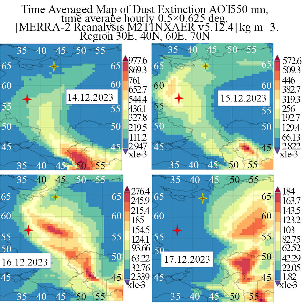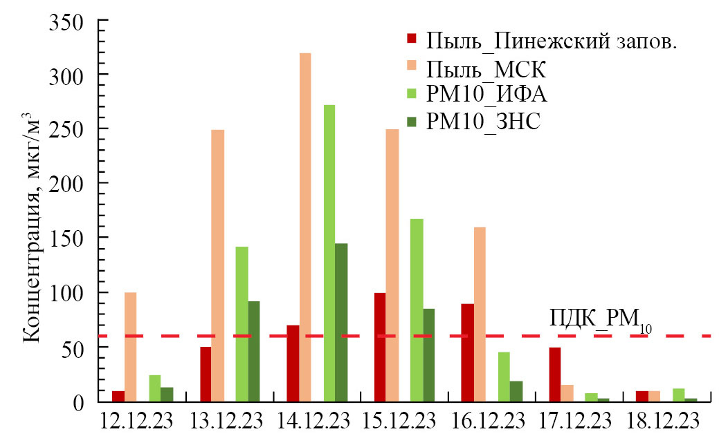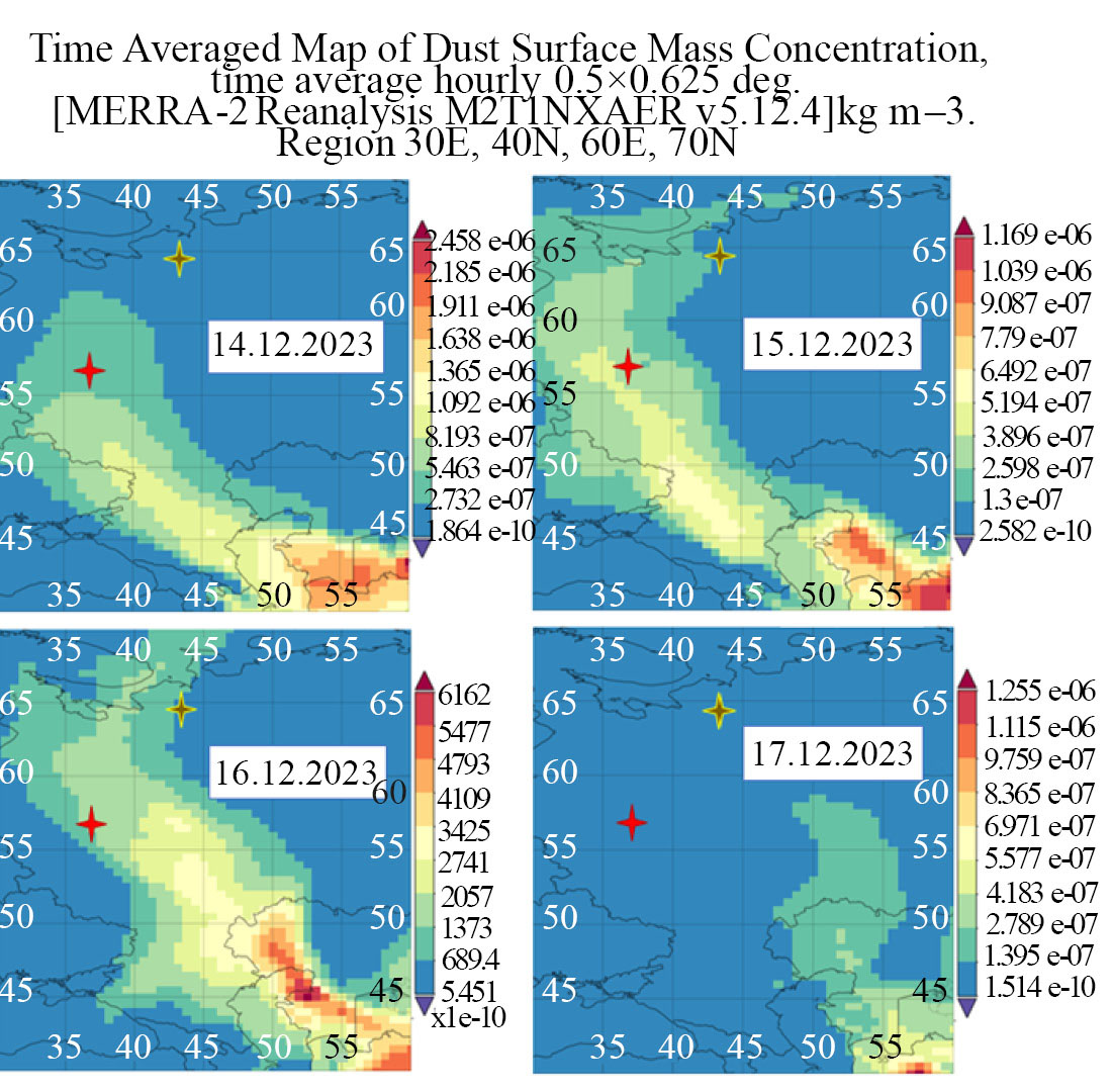 На рис. 6 представлена диаграмма временной изменчивости среднесуточных значений концентрации пыли, определенной по результатам численных оценок реанализа MERRA-2 в сравнении с данными измерений концентрации аэрозольных частиц РМ10 в Москве и пригороде до, во время и после эпизода аномально высокого роста аэрозольного загрязнения в декабре 2023 г. Как видно из рисунка 6, численные оценки концентрации пыли в приземном воздухе в районе Пинежского заповедника (вблизи пос. Пинега) качественно хорошо соответствуют наблюдаемым изменениям концентрации частиц РМ10 в Московском регионе с временным запаздыванием примерно на сутки за счет более дальнего переноса. Следует отметить, что в Москве приземная массовая концентрация пылевых частиц (всех размеров), по оценкам в рамках реанализа MERRA-2, во время эпизода значительно превосходит измеренные величины концентрации аэрозоля РМ10. После эпизода она становится практически не отличима от средних зимних значений концентрации всех аэрозольных частиц в приземном воздухе Москвы зимой [15]. Из этого следует, что во время таких эпизодов дальнего атмосферного переноса пыли наиболее крупные частицы приносятся в город извне.