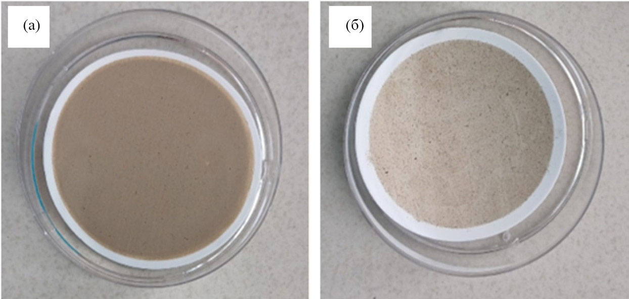 Рис. 4. Общий вид фильтров с пробами снега, отобранного на территории Пинежского заповедника: (а) – после фильтрации прослойки желтого снега (250 мл); (б) – после фильтрации усредненной пробы снежной толщи (1250 мл). Диаметр фильтра – 47 мм.