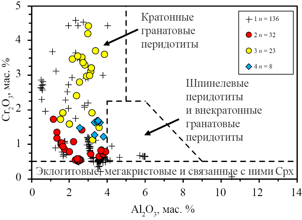 Рис. 2. Дискриминационная диаграмма Cr2O3–Al2O3 [14] и состав изученных клинопироксенов из трубки Юбилейная. 1 – хромдиопсиды, которые не прошли отбор по фильтрам [7, 8] (111 зёрен) а также хромдиопсиды из поля эклогитов, мегакристов и связанных с ними клинопироксенов (13 зёрен) и хромдиопсиды из поля шпинелевых перидотитов и внекратонных гранатовых перидотитов (12 зёрен). 2 – высокотемпературные хромдиопсиды со значениями T > 1200 °С (32 зерна) (см. рис. 3 А), 3 – хромдиопсиды со значениями T от 700 до 1200 °С (23 зерна), 4 – низкотемпературные хромдиопсиды со значениями Р < 30 кбар (8 зёрен)