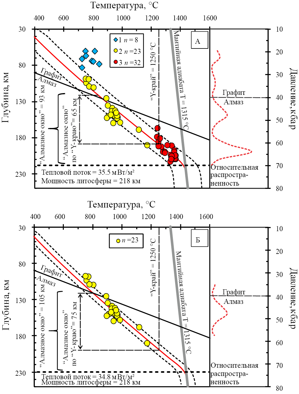 Рис. 3. Реконструированная палеогеотерма под трубкой Юбилейная. А – палеогеотерма реконструированная по 63 хромдиопсидам, тепловой поток 35.5 мВт/м2, мощность литосферы 218 км, мощность “алмазного окна” 93 км; Б – палеогеотерма реконструированная по 23 хромдиопсидам, тепловой поток 34/8 мВт/м2, мощность литосферы 230 км, мощность “алмазного окна” 105 км. Мощность “алмазного окна” по “Y-краю” [9] – 65 км (А) и 75 км (Б). Пунктирные линии – погрешность реконструкции геотермы. 1 – низкотемпературные хромдиопсиды со значениями Р < 30 кбар (8 зёрен), 2 – хромдиопсиды со значениями T от 700 до 1200 °С (23 зерна), 3 – высокотемпературные хромдиопсиды со значениями T >1200 °С (32 зерна). Красная пунктирная линия – распространённость хромдиопсидов по глубине