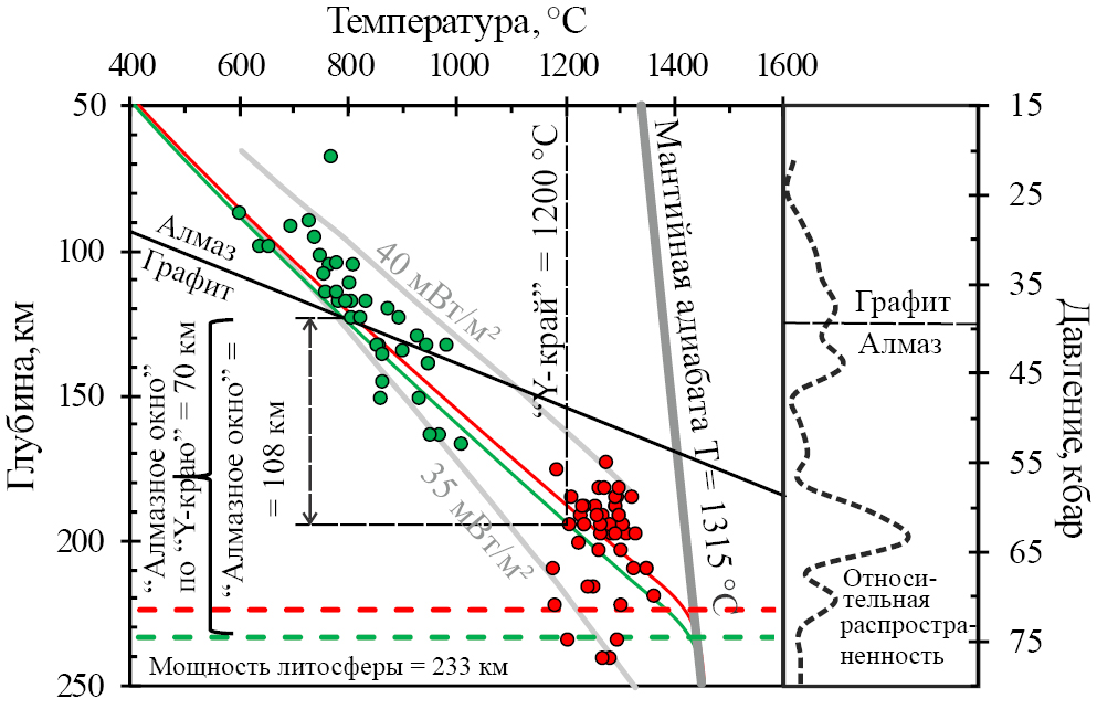 Рис. 4. Реконструированная палеогеотерма под трубкой Удачная (Далдынское поле). PT-оценки из [16]. Красные кружки – переходные и катаклазированные перидотиты, зелёные кружки – крупнозернистые перидотиты. Красная сплошная линия – палеогеотерма, реконструированная по хромдиопсидам из переходных, катаклазированных и крупнозернистых перидотитов. Тепловой поток – 35.1 мВт/м2, мощность литосферы 224 км, мощность “алмазного окна” 99 км. Зелёная сплошная линия – палеогеотерма реконструированная по хромдиопсидам только из крупнозернистых перидотитов. Тепловой поток – 34.7 мВт/м2, мощность литосферы 233 км, мощность “алмазного окна” 108 км, мощность “алмазного окна”, определённая по “Y-краю” в гранатах, согласно [9], составляет 70 км. Красная и зелёная пунктирные линии – граница астеносфера-литосфера. Чёрная пунктирная линия – распространённость клинопироксенов по глубине. Модельные кондуктивные геотермы из [20]
