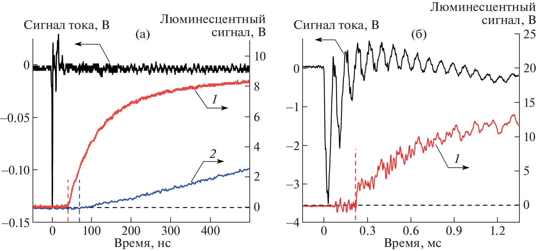 Pulsed cathodoluminescence of crystals and ceramics was excited by runaway electron beams with a duration of 10–12 ps and electron beams with a duration of 2 ns generated in a vacuum diode. The results of comparative studies of their pulsed cathodoluminescence parameters are presented. The luminescence spectrum and the decay kinetics of the bands are shown to coincide in both cases. When excited by a beam of runaway electrons, a lower luminescence intensity is observed. Also in some cases a delay in the appearance of luminescence relative to the onset of the electron beam action was found. The mechanism for the delay appearance under excitation by a runaway electron beam is associated with the process of luminescence rise.