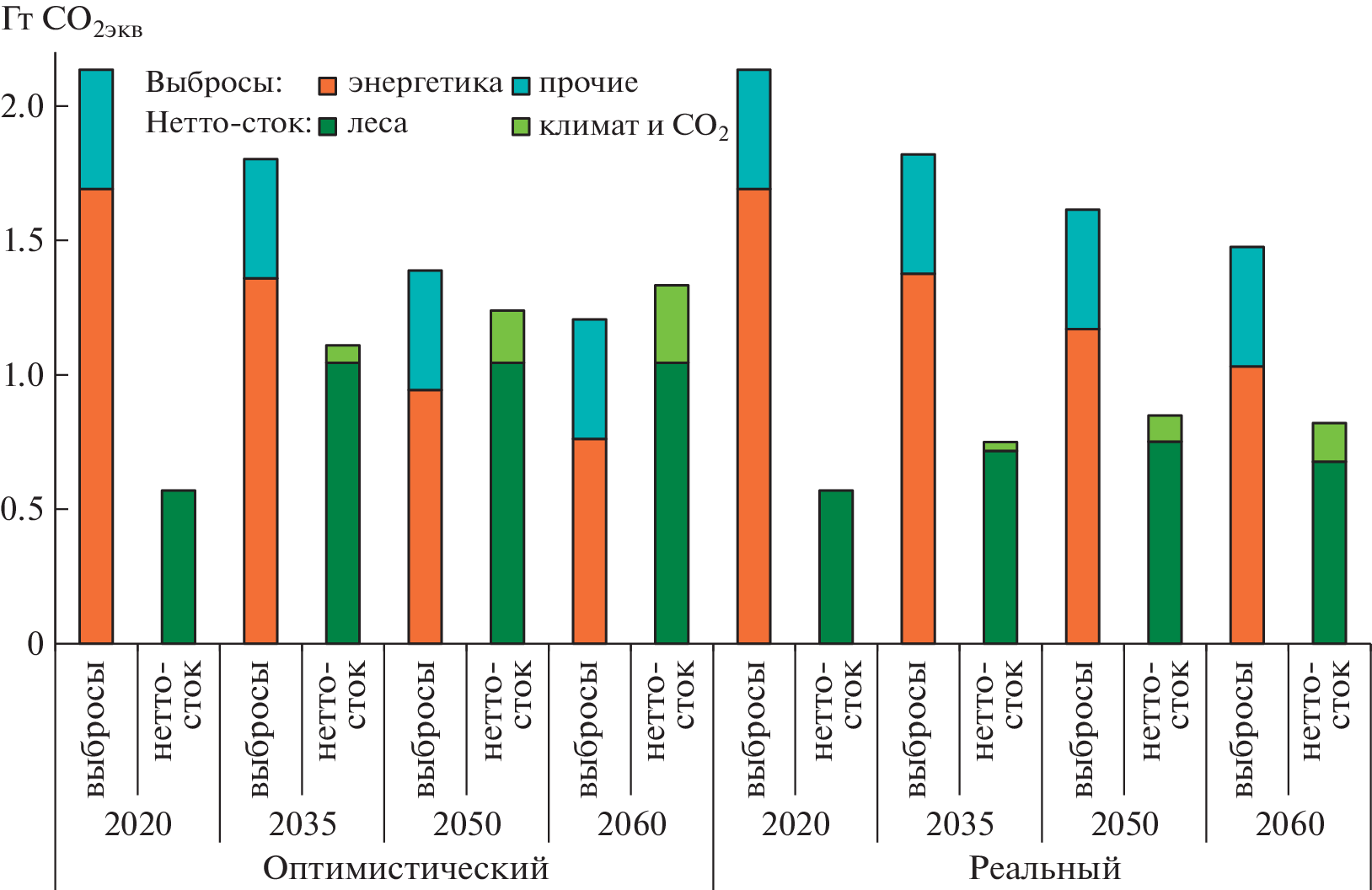 The prospects for reducing the carbon intensity of the Russian economy and the possibility of achieving climate neutrality of the national economy by 2060 are studied On the basis of a historical-extrapolation approach to the study of the development of various sociotechnical systems by comparing with the dynamics of carbon indicators of the economies of the leading countries of the world, it is shown that full compensation for anthropogenic emissions of greenhouse gases (GHGs) by absorption by the biosphere (primarily forests) is theoretically possible with implementation of difficult-to-implement large-scale reform programs in all sectors of the country’s economy – from energy to forestry. Thus, in an optimistic scenario, the rate of decline in specific GHG emissions per capita should be the maximum value achieved in the world over the past 50 years at 1% per year, and forest management should include full compensation for growing deforestation and a 50% reduction in forest losses from fires, which are currently the second (after energy) sources of GHG emissions into the atmosphere. The most likely scenario is one with a rate of reduction in specific GHG emissions per capita of 0.5% / year, and a moderate increase of the absorbing capacity of forests mainly due to the implementation of forest-climate projects and fire emission reduction. Under the latter scenario, net GHG emissions by 2060 could reach 0.7 Gt CO2eq, which would require the creation of a national industry for large-scale carbon capture and storage in order to achieve climate neutrality of the Russian economy.