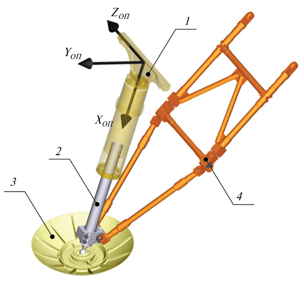 Известны различные типы посадочных устройств – надувные, устройства с выдвижным щитом и др. [2–4]. Наиболее распространенным типом посадочных устройств является механическое устройство пружинно-рычажного типа, рассмотренное в данном сообщении, включающее несколько опор (как правило, три или четыре) (рис. 1). Опоры оканчиваются тарелями, непосредственно контактирующими с грунтом. В состав опор входят энергопоглотители, расположенные внутри стакана и деформируемые ходом штока. При смятии энергопоглотителей и происходит рассеяние остаточной кинетической энергии [5, 6].