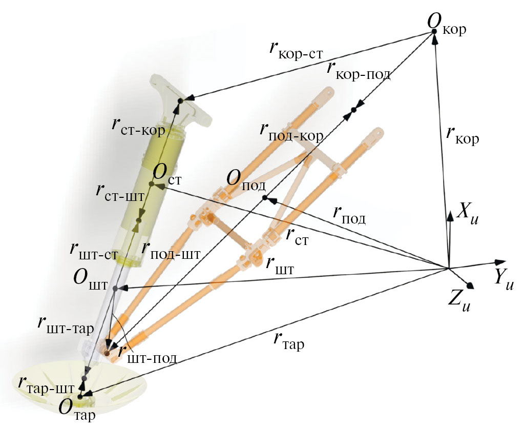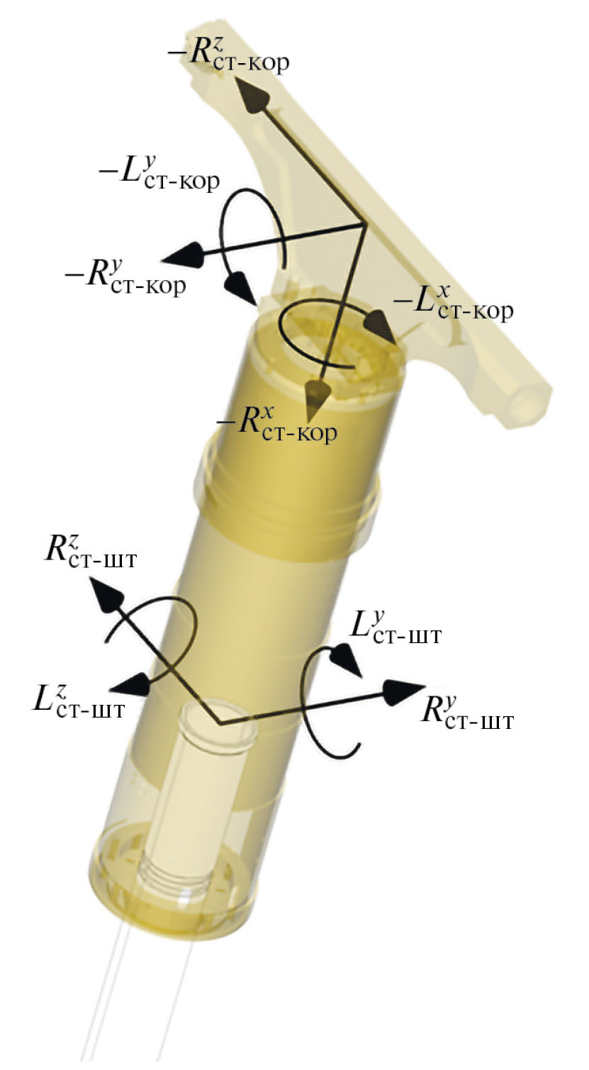 где rкор и rст – радиусы-векторы, определяющие положение центров масс корпуса и стакана в инерциальной системе координат, rкор-ст и rст-кор – радиусы-векторы, определяющие положение точки связи в связанных системах координат каждого из тел (рис. 1, 3). Двойная индексация двух последних векторов имеет следующий смысл: первый индекс означает принадлежность данного вектора телу, второй индекс – это индекс тела, с которым данное тело взаимодействует.