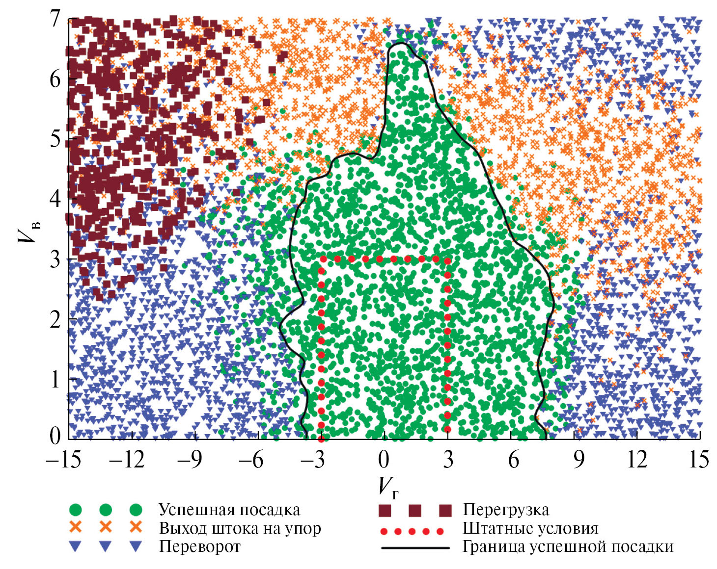 На основе распределения областей результатов можно сделать вывод, что на исход посадки сильно влияет сочетание линейных скоростей, т.е. при приоритете вертикальной скорости происходит более интенсивное сжатие амортизаторов и, как следствие, превышение предельно допустимой перегрузки и выход штока на упор, а при приоритете горизонтальной скорости – переворот.