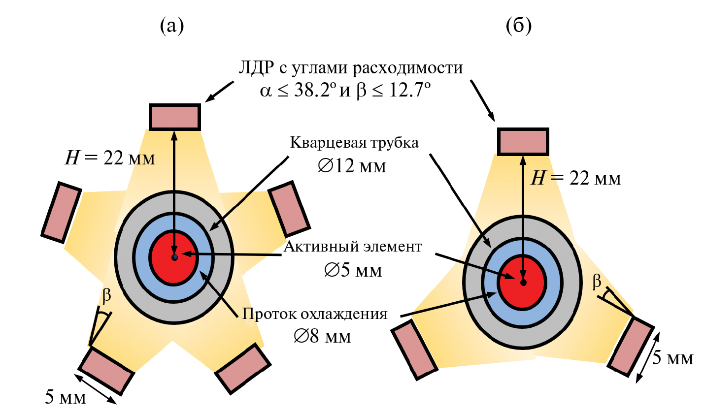 Рис. 4. Оптическая схема поперечного сечения модели квантрона с пятисторонней (а) и трехсторонней (б) диодной накачкой.