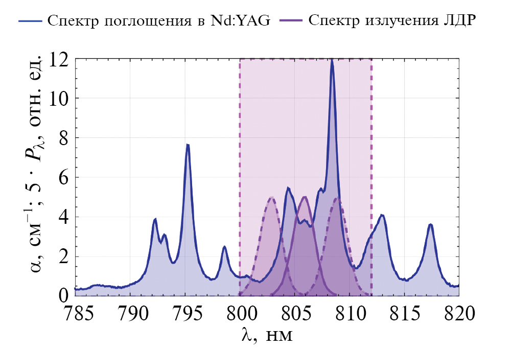 Вокруг боковой поверхности кварцевой трубки и на расстоянии Н = 22 мм от центра активного элемента расположены пять (три) источников излучения, у которых быстрая ось параллельна образующей цилиндрического активного элемента, а медленная ось ей перпендикулярна. Для охлаждения и поддержания рабочей температуры 25 °С активного элемента и ЛДР предусмотрена жидкостная система термостабилизации в виде одного замкнутого контура. В модели квантрона система охлаждения активного элемента выполнена в виде трубки (внешним диаметром 8 мм и длиной l = 120 мм) с ламинарным потоком хладагента, расположенной между кварцевой трубкой и активным элементом. Модель в программе Zemax не позволяет напрямую учитывать влияние температуры на работу квантрона, однако данный температурный параметр можно учитывать косвенно в виде конкретных спектров излучения массива диодов и поглощения активного элемента, которые должны достигаться при температуре 25 °С. На рис. 5 представлены спектр поглощения Nd3+:YAG (синий график), спектр излучения ЛДР с центральной длиной волны 806 нм (фиолетовый график) и показана область длин волн (ограниченная пунктиром), в которой возможен сдвиг спектра излучения ЛДР в пределах партии при 25 °С.