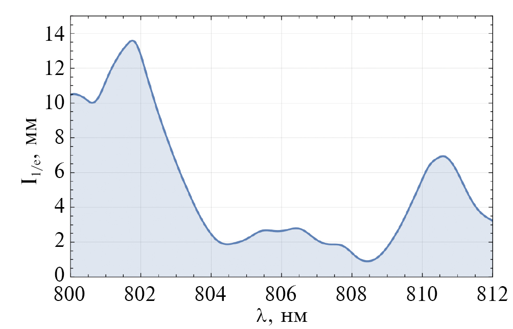 Даже при незначительном изменении температуры лазерной диодной решетки происходит сдвиг рабочей длины волны излучения (0.28 нм/°С [38]), что, в свою очередь, приводит к изменениям коэффициента поглощения (глубины поглощения в активном элементе) и выходных характеристик всей лазерной системы. Так, при изменении температуры ЛДР на 3.5 °С происходит смещение центральной длины на 1 нм, следовательно, изменяются показатели коэффициента и глубины поглощения активного элемента. Длина поглощения l1/e – расстояние от поверхности активного элемента, на котором интенсивность излучения накачки в активном элементе уменьшается в е раз. На рис. 6 представлен график зависимости глубины поглощения в Nd3+:YAG 1% ат. от длины волны излучения накачки.