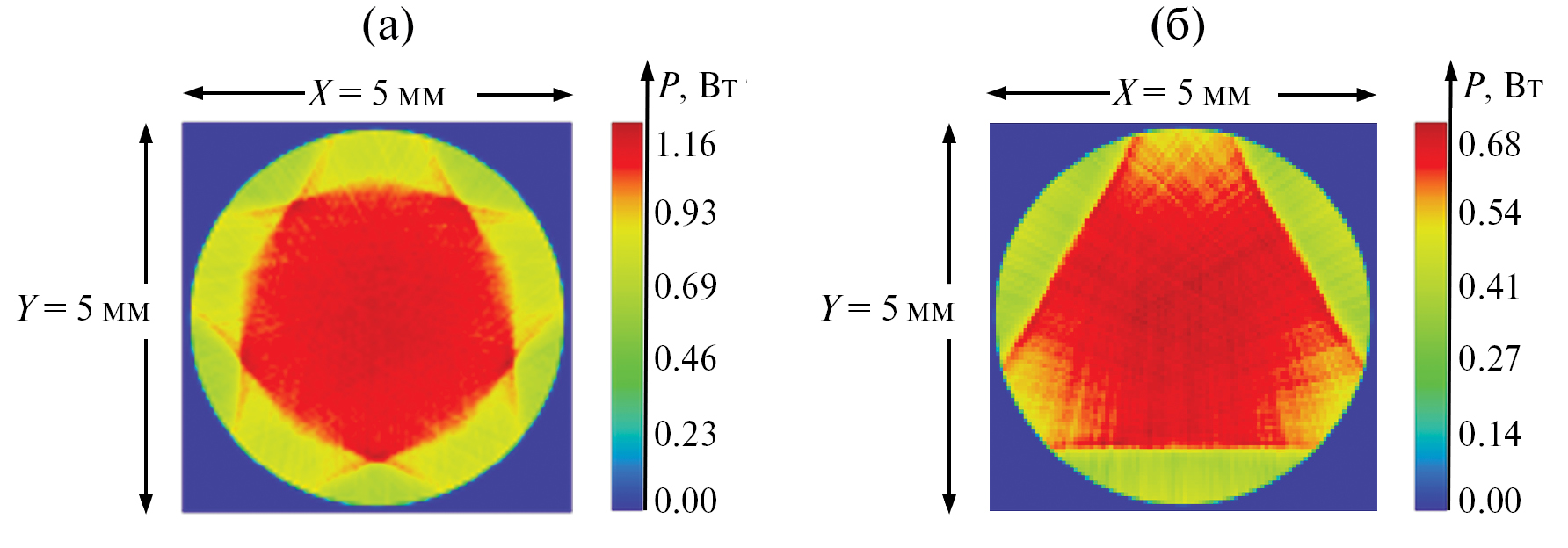 Рис. 7. Распределение поглощенной мощности излучения по поперечному сечению Nd3+:YAG в математической модели Zemax с пятисторонней (а) и трехсторонней (б) накачками.