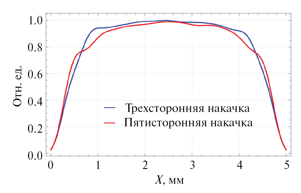 Рис. 8. Пространственное распределение поглощенной мощности излучения в серединном горизонтальном разрезе поперечного сечении активного элемента с пятисторонней (красный график) и трехсторонней (синий график) накачками.