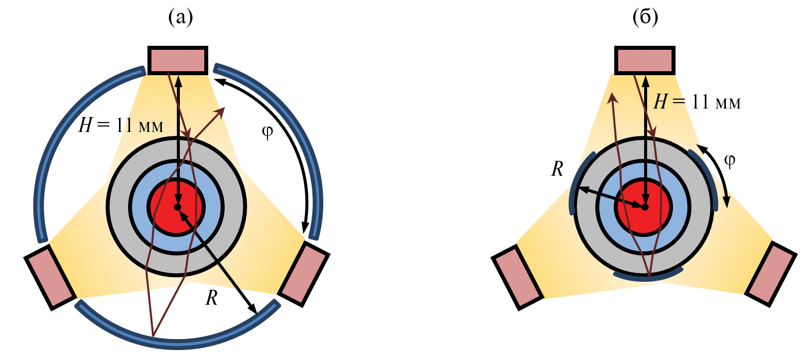 Наличие в квантроне системы сегментных отражателей приводит к отражению излучения, непоглощенного в активном элементе, прошедшего мимо активного элемента или отраженного с поверхностей оптических сред, а следовательно, к понижению соответствующих потерь и повышению эффективности накачки активного элемента. Используются два типа сегментных отражателей: отражающее металлическое напыление на внешней стороне кварцевой трубки и металлический с отражающим покрытием. Сегмент отражателя характеризуется параметрами: φ – угол дуги сегмента, R – радиус дуги сегмента. Для расчета эффективности накачки активного элемента в квантроне с системами отражателей используется модель квантрона с трехсторонней оптической накачкой общей мощностью 6 кВт и расстоянием Н = 11 мм между источником излучения и центром активного элемента и с эффективностью накачки ηнак = 77%. Проведена серия численных экспериментов, в которых изменялся радиус R металлического отражателя с максимальным углом φ, при котором отражатели не перекрывают излучение накачки, а также угол φ металлического напыления с фиксированным радиусом R = 6 мм, равным внешнему радиусу кварцевой трубки. На рис. 10 показаны схемы поперечного сечения модели квантрона с системой отражателей и схематически изображен ход одного из лучей ЛДР.