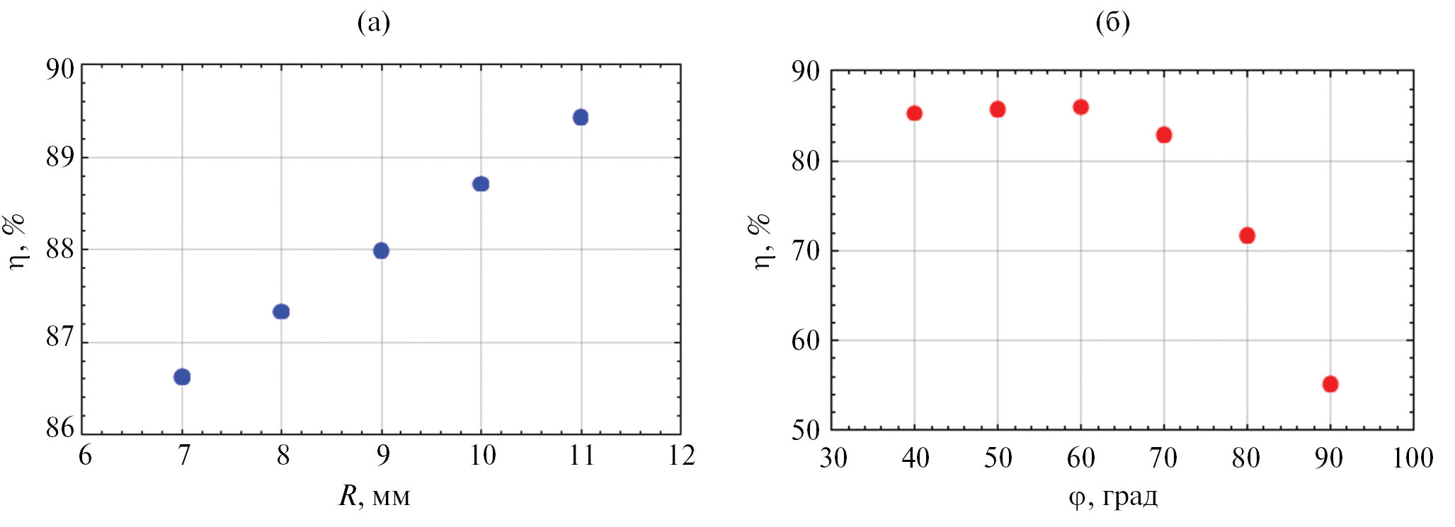 Рис. 11. Значения эффективности накачки активного элемента при различных значениях радиуса R металлического отражателя (а), угла φ дуги сегмента металлического напыления на кварцевой трубке (б).
