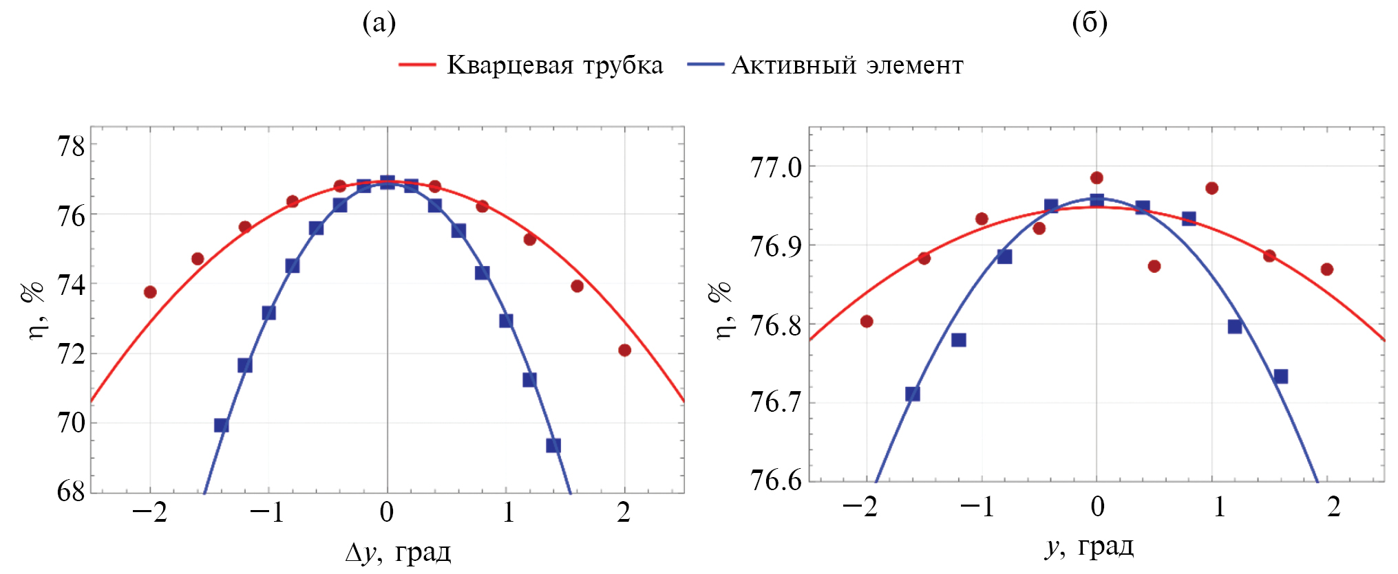 Рис. 12. Значения эффективности накачки активного элемента при допустимой погрешности в установке активного элемента и кварцевой трубки: (а) ∆y – смещение элементов вдоль оси y; (б) γ – угол поворота относительно центра активного элемента вокруг оси y.