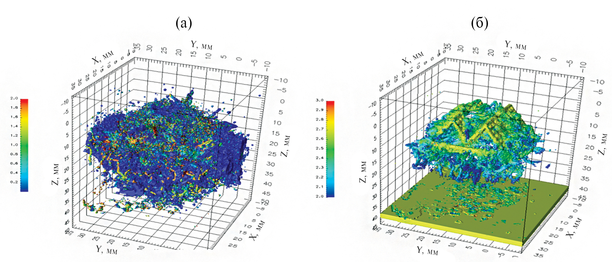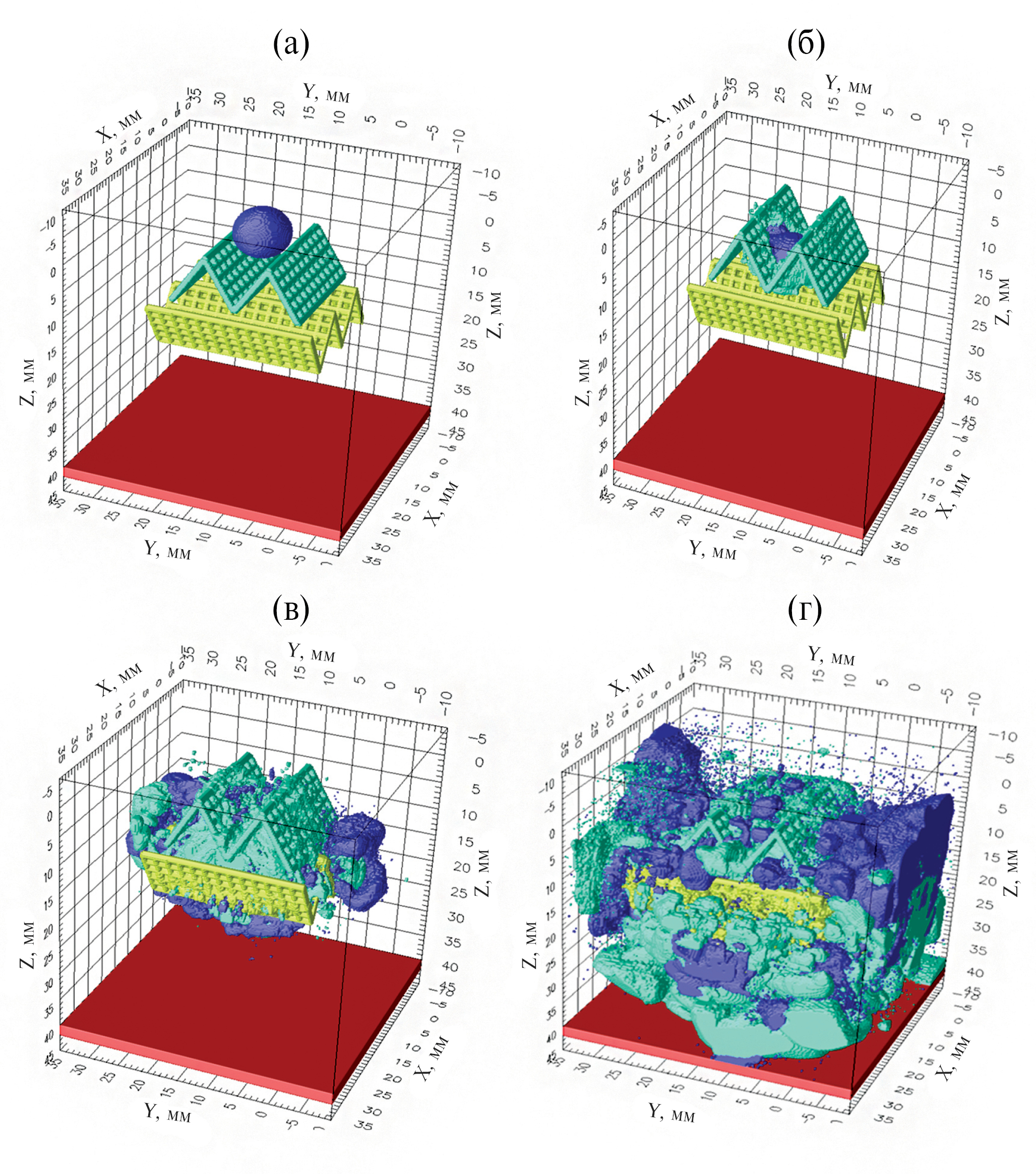 На рис. 1 показаны расчетные конфигурации взаимодействующих тел при начальной скорости ударника 10 км/с в моменты времени t = 0, 10, 20 и 30 мкс. Из анализа результатов расчета видно, что начиная с момента времени t = 28 мкс начинается взаимодействие частиц осколков ударника и защитной сетки с алюминиевой пластиной-детектором. В ходе процесса сеточная конструкция фрагментирует ударник (на рис. 1 показан синим цветом) на отдельные конгломераты осколков, которые продолжают дробиться и рассеиваться далее. Анализ расчетного поля плотности показал, что головная часть облака осколков состоит преимущественно из низкоплотных частиц алюминия и хондрита с ρ < 2 г/см3. Так, на рис. 2 представлено расчетное 3D-поле плотности в момент времени t = 40 мкс: отдельно для облака низкоплотных осколков с ρ = 0.01–2 г/см3 (рис. 2а) и для диапазона плотностей ρ = 2–3 г/см3 (рис. 2б). Такое распределение плотности в облаке способствует более сглаженной по времени передаче нагрузки на защищаемый объект, чем в случае прямого удара без защитного сеточного экрана.
