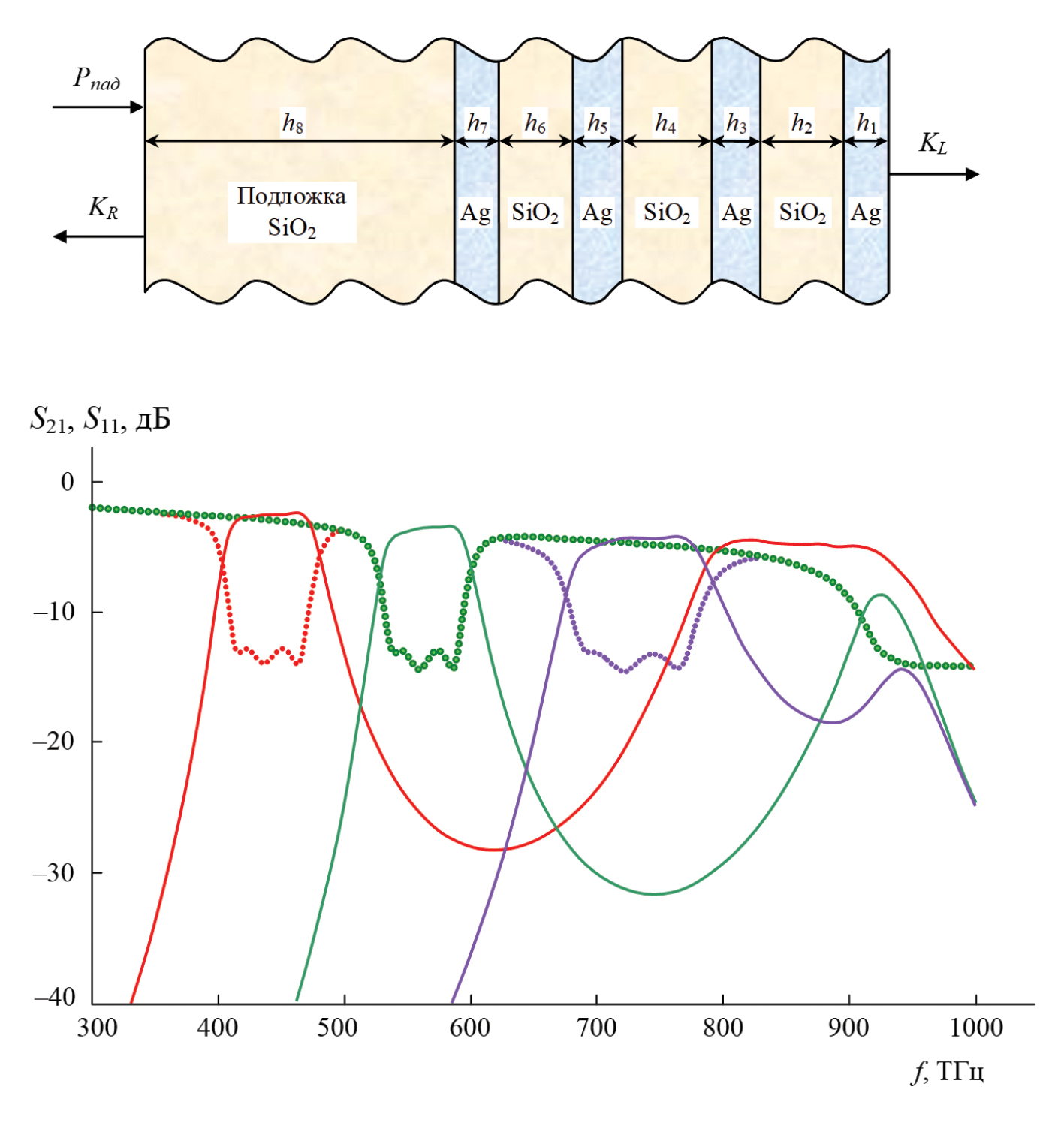 Рассмотрим конструкцию фильтра третьего порядка в свободном пространстве (рис. 2), состоящего из чередующихся слоев серебра и кварца с толщинами h1, h2 … h7, осажденных на подложку из кварцевого стекла толщиной h8 = 0.5 мм. В этой конструкции три четных слоя из SiO2 являются полуволновыми резонаторами, формирующими полосу пропускания фильтра, а нечетные слои из Ag служат зеркалами, обеспечивающими оптимальные связи резонаторов друг с другом и со свободным пространством. С использованием описанной выше методики электродинамического анализа многослойных структур была написана программа для расчета АЧХ такой структуры, с помощью которой производился параметрический синтез фильтров.