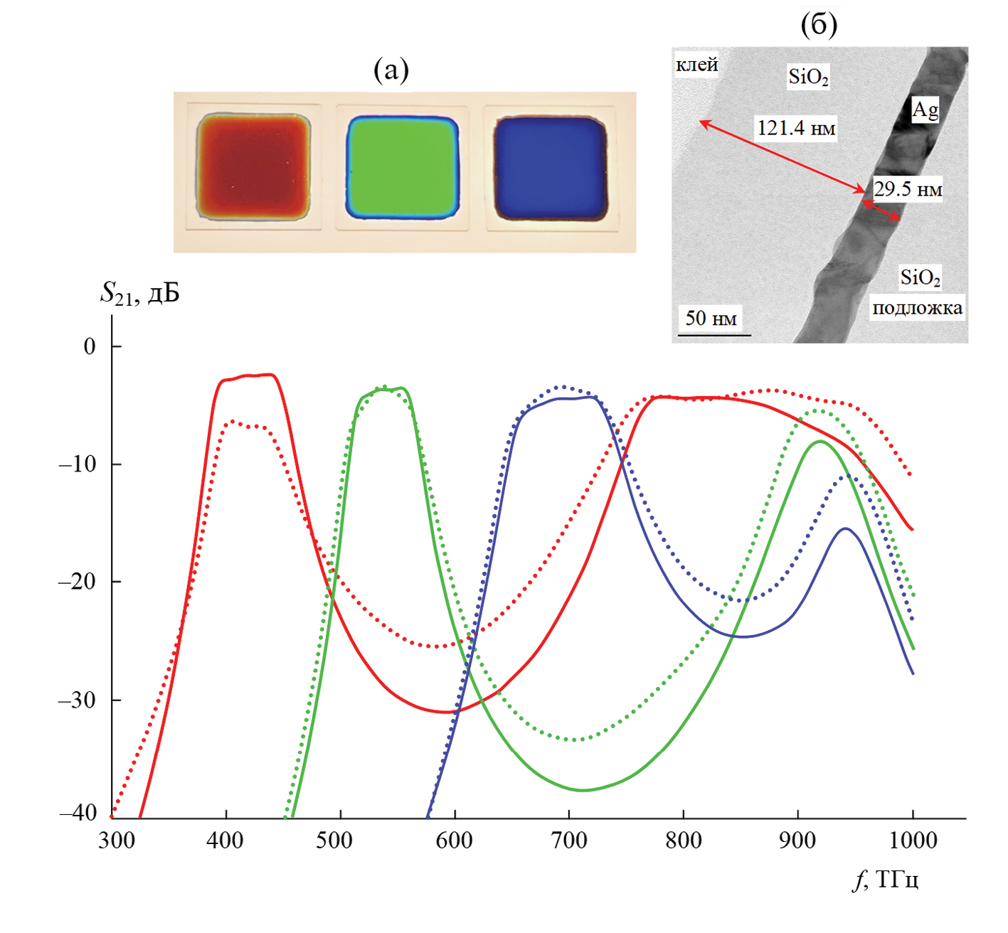 Рис. 3. АЧХ опытных образцов фильтров третьего порядка (точки) и АЧХ их одномерных моделей, настроенных на полосы пропускания опытных образцов по уровню –3 дБ от уровня минимальных потерь (линии). На вставках: а – фотографии опытных образцов, снятые на просвет, б – фотография поперечного среза двухслойной структуры Ag–SiO2.