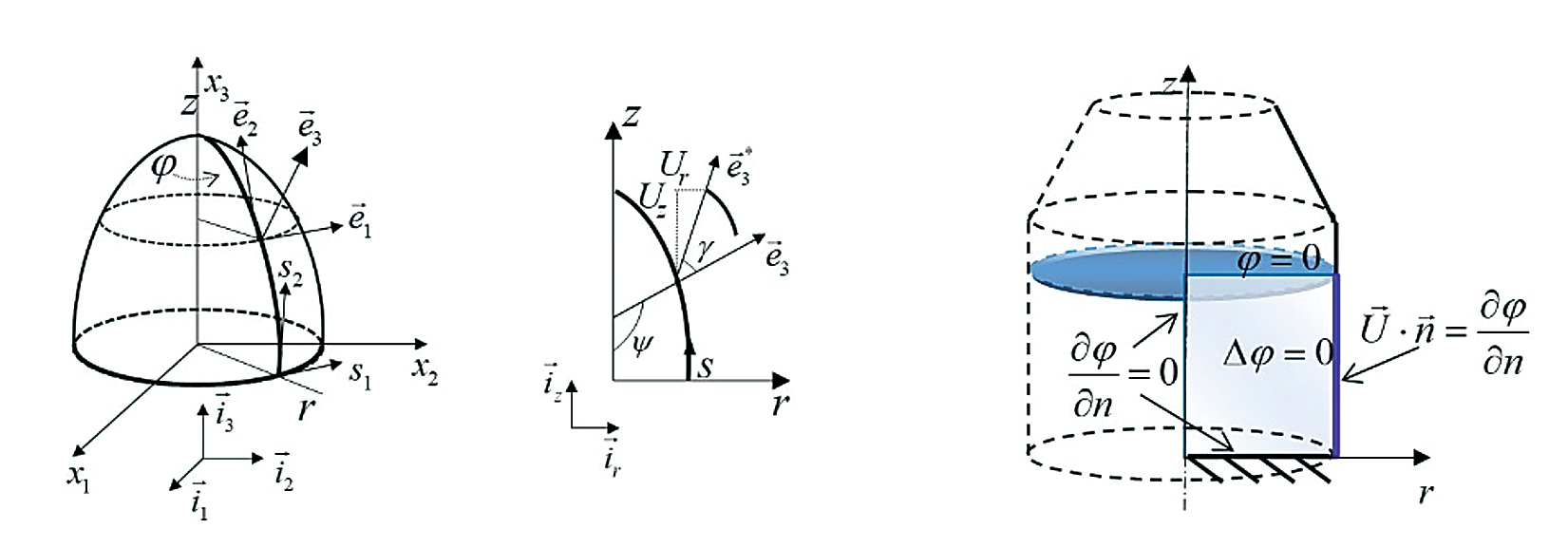 где – характерный геометрический размер оболочки (например, длина меридиана, радиус), , . Введем безразмерный параметр длины меридиана ξ, т.е. s = s(ξ). Определим параметры Ламе следующими соотношениями: A1 = r, A2 = s,ξ, и dα1 = dφ, dα2 = dξ, здесь и далее нижний индекс после запятой означает дифференцирование по этой переменной.