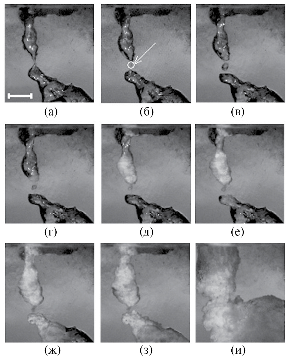 Рис. 1. Распространение парового взрыва при распаде струи расплавленной соли NaCl в воде (температура воды tв = 23°С, температура соли в тигле tNaCl = 1100°С, числа подобия для струи Re = 2070, Oh = 1.4 ∙ 10–3). Время экспозиции – 4.5 мкс. Время от кадра момента распада струи (а): 1.11 мс (б); 1.87 (в); 1.99 (г); 2.02 (д); 2.03 (е); 2.05 (ж); 2.08 (з); 2.34 мс (и). Белой стрелкой обозначена капля-сателлит, образовавшаяся при распаде струи. Верхняя граница кадров соответствует уровню воды в емкости.
