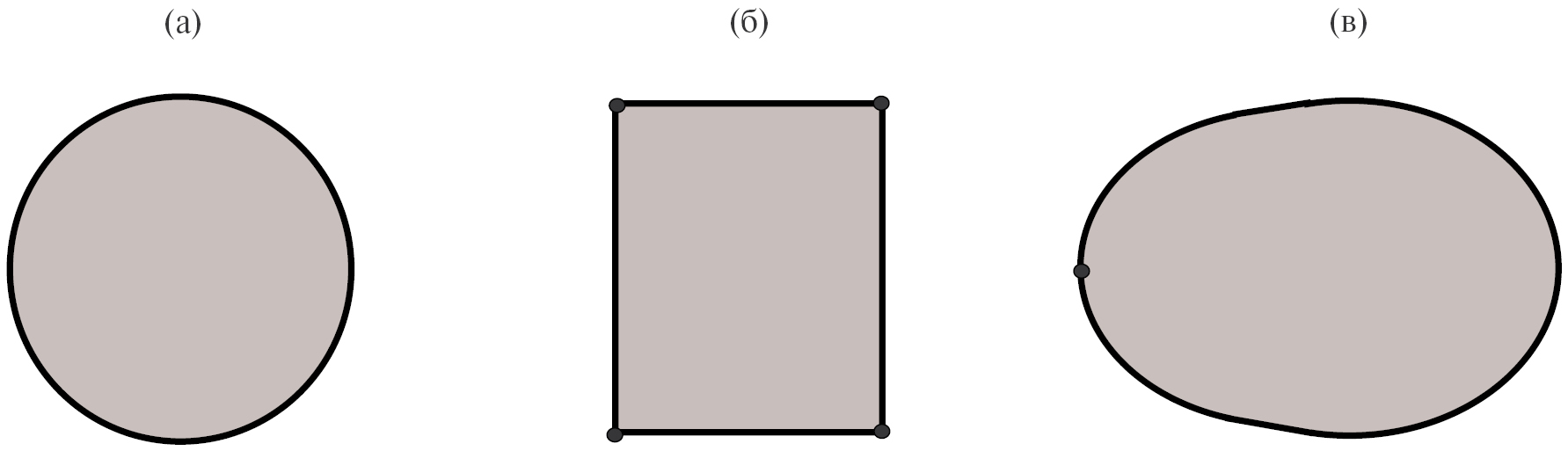 Рис. 2. Круговое, прямоугольное и яйцевидное продольные сечения прокладки. Постоянная и нулевая кривизны (a, б). Угловые точки (б) и единственная точка максимальной кривизны (в) снабжены меткой •.