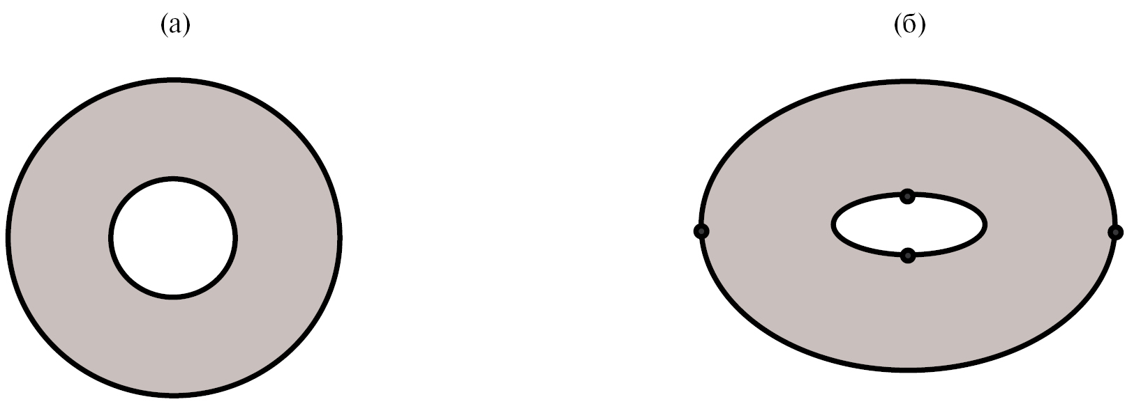 Для кругового и эллиптического колец (рис. 4) асимптотические серии (17) собственных чисел задачи (1), (2) тиражируются: асимптотические конструкции годятся соответственно для внутренней окружности на рис. 4a, или нескольких точек глобальных и локальных максимумов кривизны, помеченных значком • на рис. 4б.