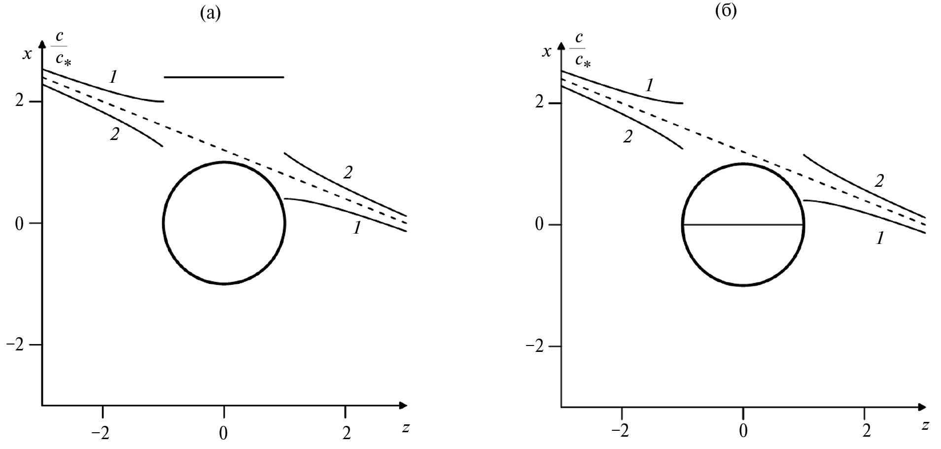 Рис. 5. Распределение концентрации соли в растворе с глубиной при ki/ke = 0.1 и Rao = 0 (1); Rao = 30 (2) a – включение содержит сильно концентрированный раствор; б – включение содержит аномально слабо концентрированный раствор; γсr0 = 10 г/л, с0/γсr0 = 3, ki/ke = 0.1, c* = 25 г/л.