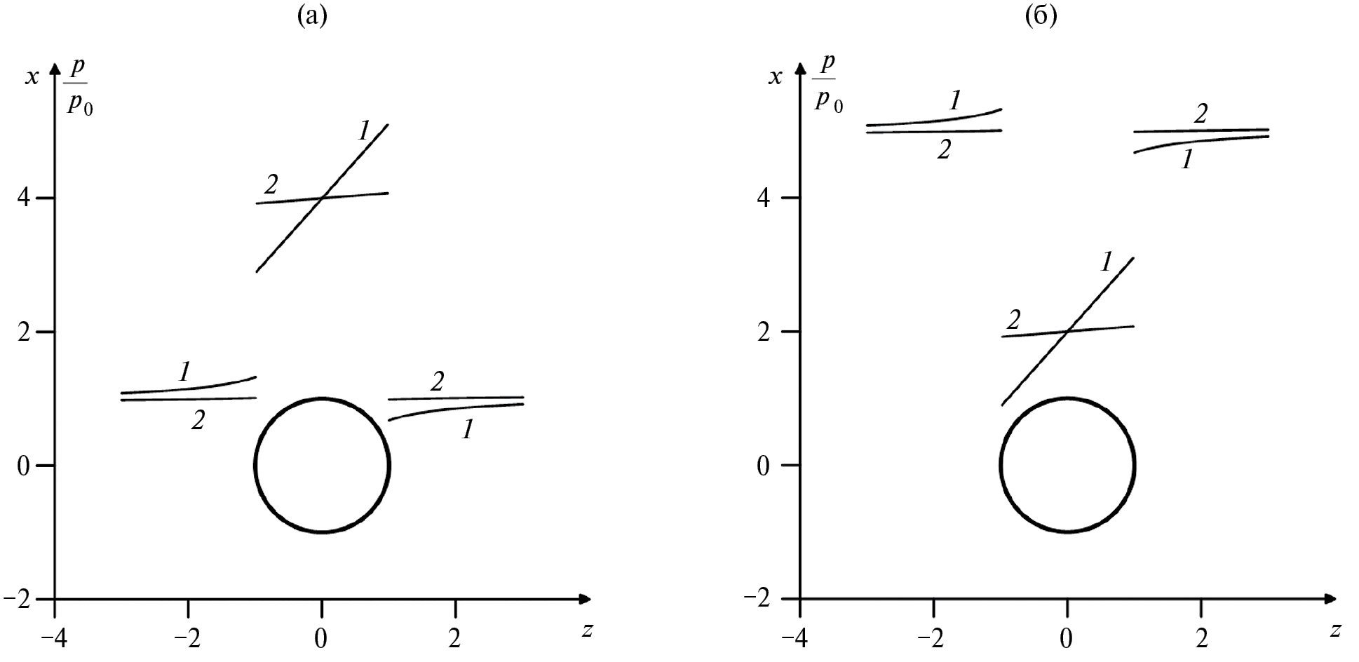 Рис. 6. Распределение безразмерного давления в растворе при ki/ke = 0.3 и Raо = 0 (1); Raо = 30 (2); p0 = 1.2 МПа: a – включение содержит сильно концентрированный раствор, избыточная концентрация равна С0–с0 = 36 г/л; б – включение содержит аномально слабо концентрированный раствор.