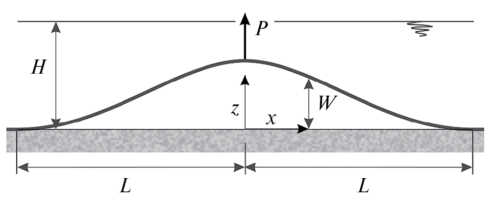 pg, pf – давления сред внутри и вне трубы на уровне осевой линии. Давление меняется от значения на дне водоема до атмосферного давления p0 на поверхности воды. Ввиду принятого отношения L/H > 10 и глубины H ≤ 10 м изменение давления по всей длине поднятой части происходит плавно, а максимальное значение pf ≈ 0.2 МПа. При этом внутреннее давление pg может быть большим, например в газопроводах pg ≈ 12 МПа. Однако при подъемных работах оно сбрасывается. Если в оценках функцию прогиба w(x) принять в виде cos(πx/L) + 1, то отношение второго члена в уравнении (3) к первому имеет порядок и мало по сравнению с единицей. Поэтому в дальнейшем анализе второй член в (3) опускаем. Исключим из рассмотрения случаи направления силы вниз (P < 0) и превышение подъемной силы воды над весом трубы и транспортируемой среды (q < 0). Значение q < 0 соответствует всплытию трубопровода без приложения подъемной силы.