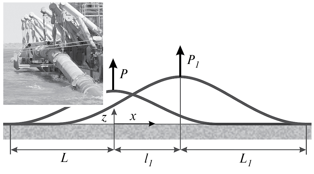 1. Мероприятия по укладке трубопроводов на морское дно, а также по профилактике, ремонту и восстановлению их работоспособности связаны с приложением внешних поперечных сосредоточенных сил для подъема их определенного участка. Под действием весов трубы и транспортируемой среды, выталкивающей силы воды, внутреннего и внешнего давлений, внешней сосредоточенной силы труба подвергается изгибу. Анализу возникающих вопросов в указанных направлениях посвящено большое количество работ.