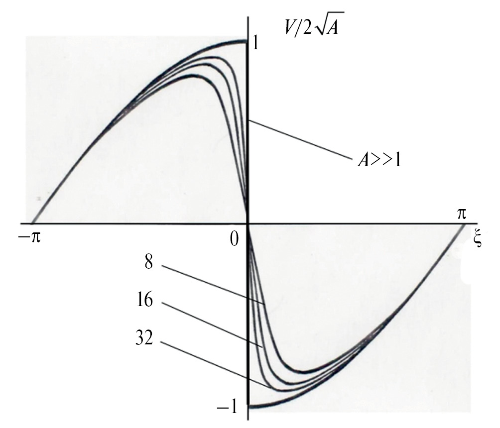 Здесь – параметр. Аргумент функции определен в области . Из (27) следует, что соответствующая область изменения расстройки дается неравенствами . При происходит бифуркация и стационарная волна становится разрывной. Скачок появляется в каждом периоде профиля, связывая две ветви решения (26). Для разрывной волны