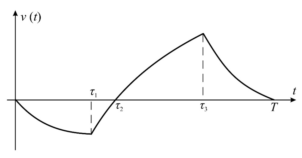 Будем рассматривать движения, при которых управление всегда максимально по величине и принимает одно из крайних значений Без нарушения общности полагаем, что на начальном участке, и при этом . Периодическое изменение скорости будет построено в соответствии со схемой, представленной на рис. 2, где моменты времени , удовлетворяющие неравенствам
