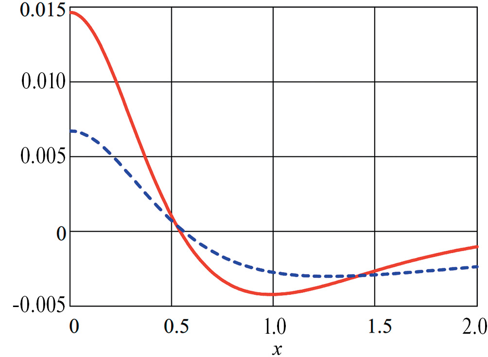 На рис. 1 показаны кривые распределения нормальных напряжений в полосе и в упругой неограниченной плоскости в сечении на отрезке . На рис. 2 показаны изменения поперечных перемещений в сечении на отрезке . Сплошным кривым соответствует решение в полосе, штриховым – в неограниченной плоскости. Решение для плоскости строилось с помощью метода начальных функций в пространстве преобразований Фурье [17]. Считалось, что .