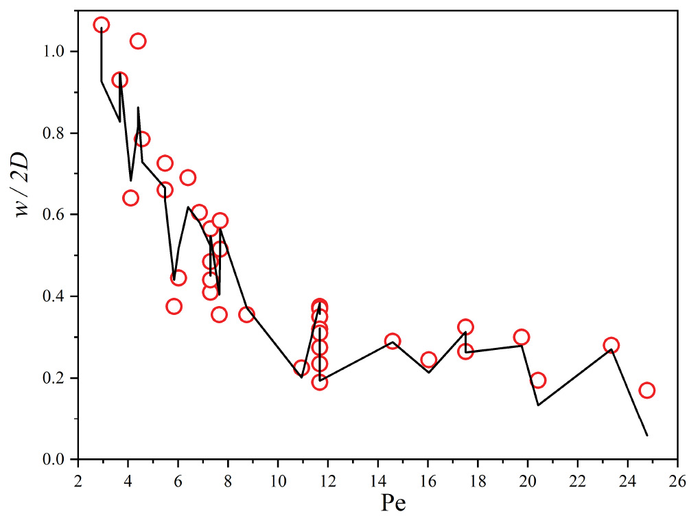 Рис. 3. Безразмерная полуширина проплава w/2D в зависимости от числа Пекле Pe. Сравнение экспериментальных результатов (кружки) с расчетами (линия) по формуле (10) при n = 0.35, k = 1.