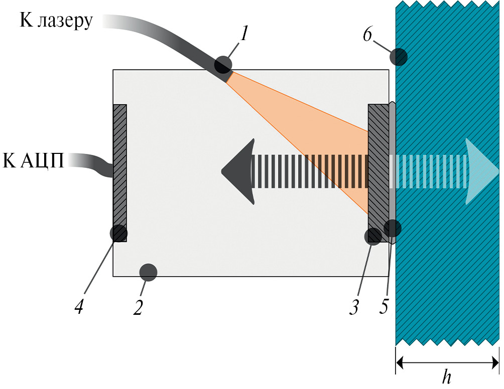 Для термооптического возбуждения ультразвука в широкой полосе и его приема в эхо-режиме использовался дефектоскоп УДЛ-2М. Дефектоскоп состоит из возбуждающей и принимающей УЗ-частей, изображенных на рис. 1 вместе в сокращенном виде. Возбуждение звука осуществляется с помощью лазера с диодной накачкой с длиной волны 1053 нм, излучающего импульс длительностью 10 нс по полувысоте и c максимальной энергией 300 мкДж. Через оптоволокно 1 лазерный импульс подводится внутрь звукопровода 2 на оптико-акустический преобразователь 3, который преобразует импульсы лазерного излучения в импульсы ультразвука, распространяющиеся в звукопроводе и вне его в виде пучков с гауссовским поперечным распределением (начальный диаметр УЗ-пучков по уровню 1/e составлял 5.5 мм). Ушедший в звукопровод УЗ-импульс (темная стрелка) попадает на широкополосный пьезопреобразователь 4 первым – это зондирующий УЗ-импульс. Прошедший через водную иммерсию 5 в образец 6 УЗ-импульс (светлая стрелка) будет многократно переотражаться от его параллельных торцов (реверберировать), частично проходя в звукопровод и на пьезопреобразователь. Термином “приемный преобразователь” далее мы будем называть пару звукопровод–пьезопреобразователь. Напряжение с пьезопреобразователя обрабатывается АЦП, вследствие чего формируется дискретный сигнал.
