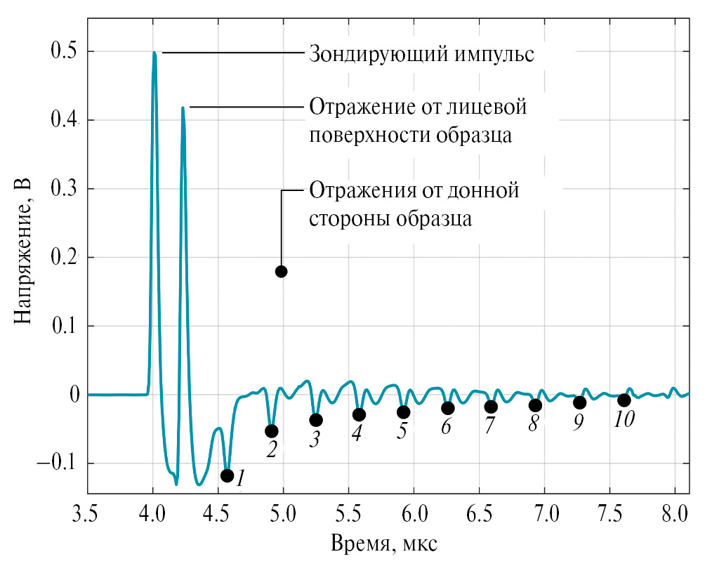 Исходный (необработанный) сигнал приведен на рис. 2. В нем можно выделить зондирующий импульс, состоящий из фазы сжатия длительностью ~60 нс по уровню 1/e и следующей за ней более длительной фазы разрежения, появляющейся за счет дифракции низкочастотных составляющих импульса при его распространении внутри преобразователя. Далее следует импульс отражения от лицевой поверхности образца и импульсы многократных отражений внутри образца (реверберации). Кроме импульсов продольных волн, в сигнале возникают импульсы сдвиговых волн. Причиной их появления является ограниченность акустического пучка, который отражается от свободной донной поверхности образца.