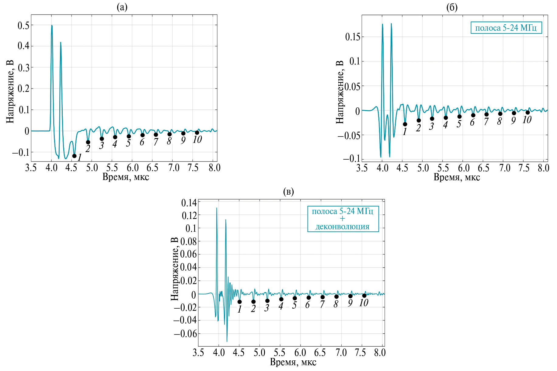 Рис. 3. Этапы обработки сигнала с отраженными УЗ-импульсами для образца толщиной 1 мм: без обработки (а), после цифровой фильтрации (б), после цифровой фильтрации и деконволюции (в).