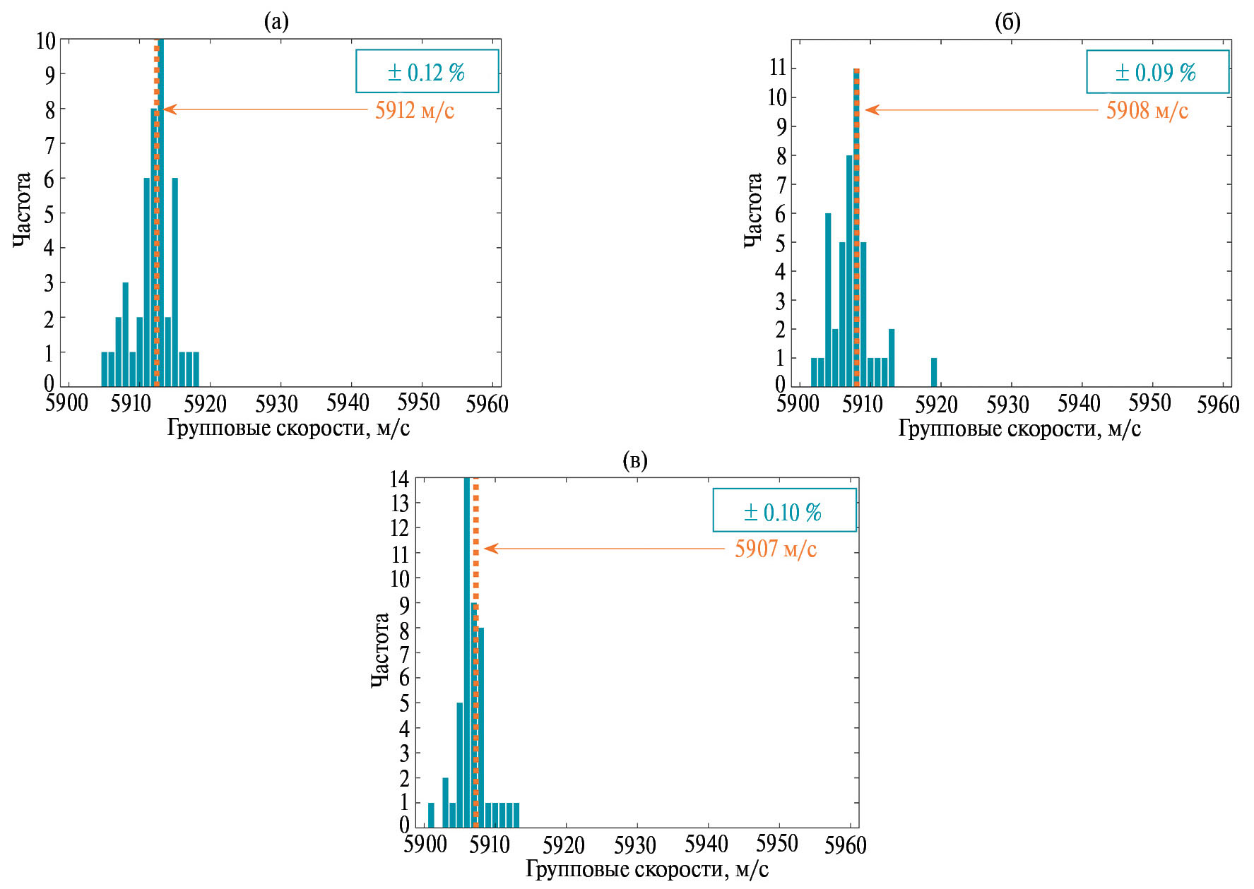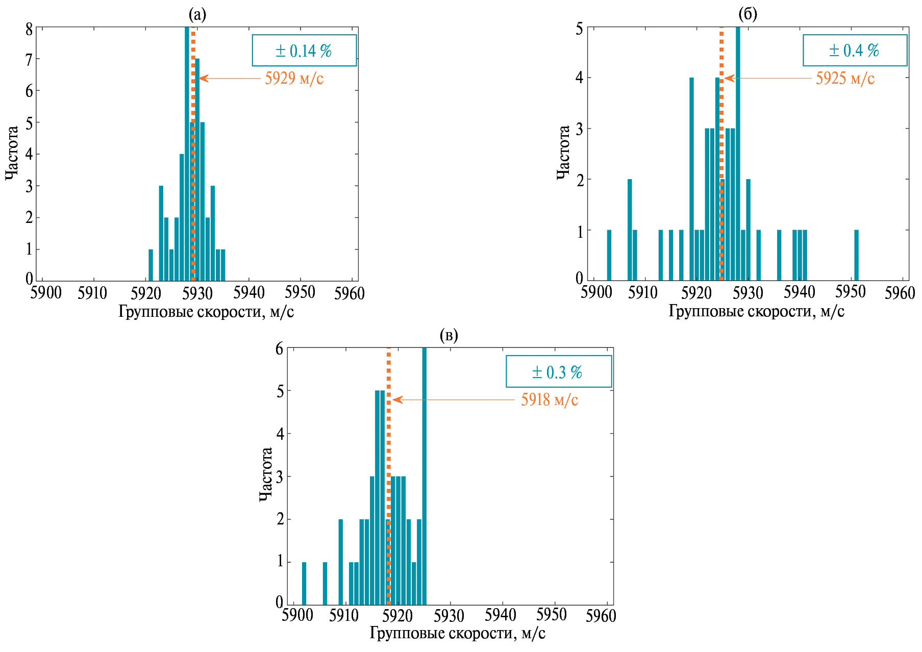 Рис. 4. Гистограммы частоты выпадания значения групповой скорости для образцов 1.000 (а), 1.500 (б) и 1.900 мм (в) без применения деконволюции. Оранжевым цветом указано среднее значение скорости в данном распределении, а число в синей рамке – наибольшее относительное отклонение от среднего.