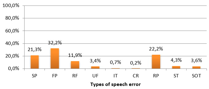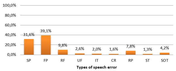 The researchers discovered various frequency of each of those speech faults. The participants made a variety of speech errors, with filled pauses occurring the most frequently (39,1% or 120 times), followed by silent pauses (31,6% or 97), repeats (7,8% or 24 times), slips of the tongue (4,2% or 13 times), unretracted false starts (2,6% or 8 times), interjections (2,0% or 6 times), and corrections (1,6% or 5 times). Stuttering occurs the least frequently (1,3% or 4 times).