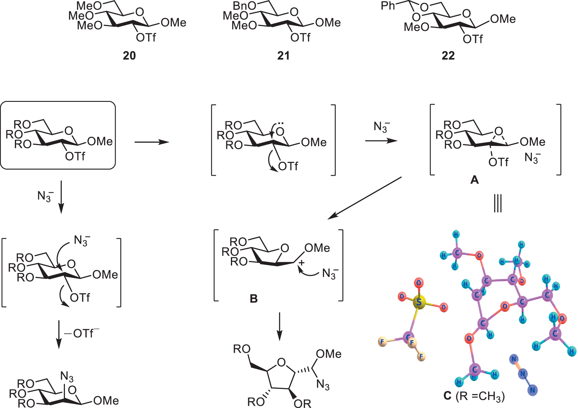 In the course of the synthesis of oligosaccharides related to fragments of the capsular polysaccharide of Haemophilus influenzae type e, the transformations of various 2-O-trifluoromethanesulfonate derivatives of β-D-glucopyranosides in reactions with an azide anion was studied. It gives the products of both nucleophilic substitution and a rearrangement of the 6-membered pyranose ring with its contraction to the 5-membered one through (О-5–С-2)-cyclization. Their formation was interpreted for the first time using quantum mechanical calculations.
