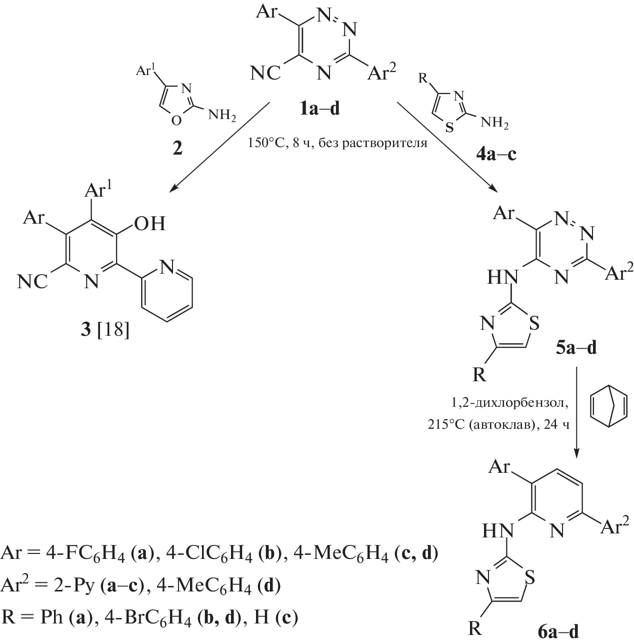 An interaction of 6-aryl-1,2,4-triazine-5-carbonitriles with 2‑amino-substituted thiazoles and oxazoles has been studied. The difference in the reactivity of these aminoheterocycles depending on the presence of an oxygen or sulfur atom in their composition has been demonstrated. Previously, the 4-aryl-3-hydroxy-2,2'-bipyridines were obtained as products of aza-Diels–Alder reaction between 6-aryl-3-(2-pyridyl)-1,2,4-triazine-5-carbonitriles and 2-amino-4-aryloxazoles. In the present work we have shown that the reaction of 6-aryl-1,2,4-triazine-5-carbonitriles with 2-aminothiazoles led to the products of ipso-substitution of cyano-group. The aza-Diels–Alder reaction of these compounds with 2,5-norbornadiene allowed to obtain (2,2'-bi)pyridines with the thiazol-2-amine moiety at alpha-position.
